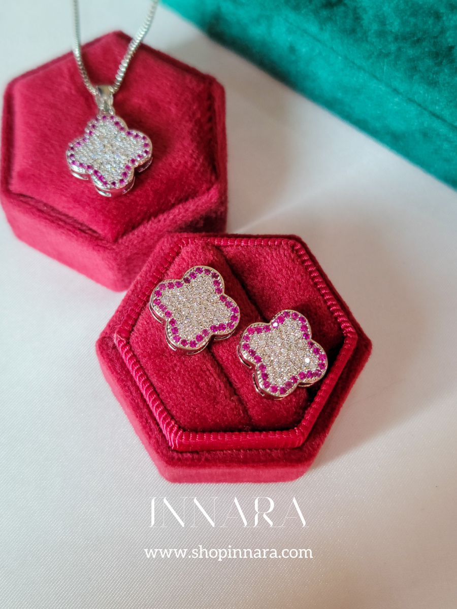 Add a touch of charm with this elegant floral pendant set, featuring sparkling white stones outlined by delicate pink accents. Perfect for both everyday wear and special occasions, it brings a graceful pop of color and shine to your look.