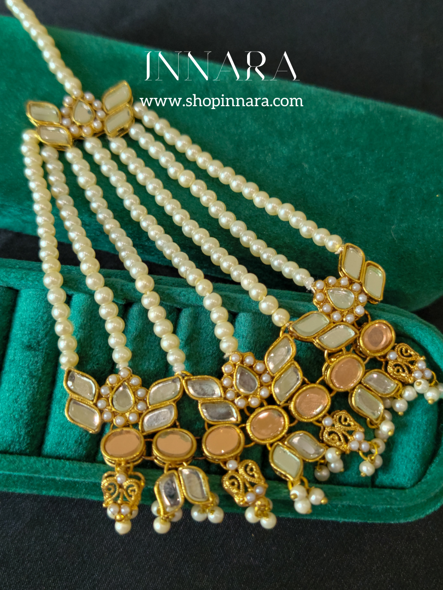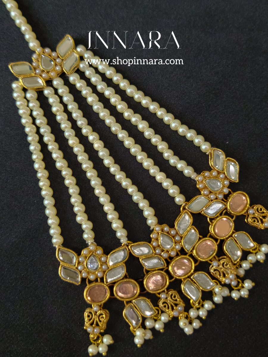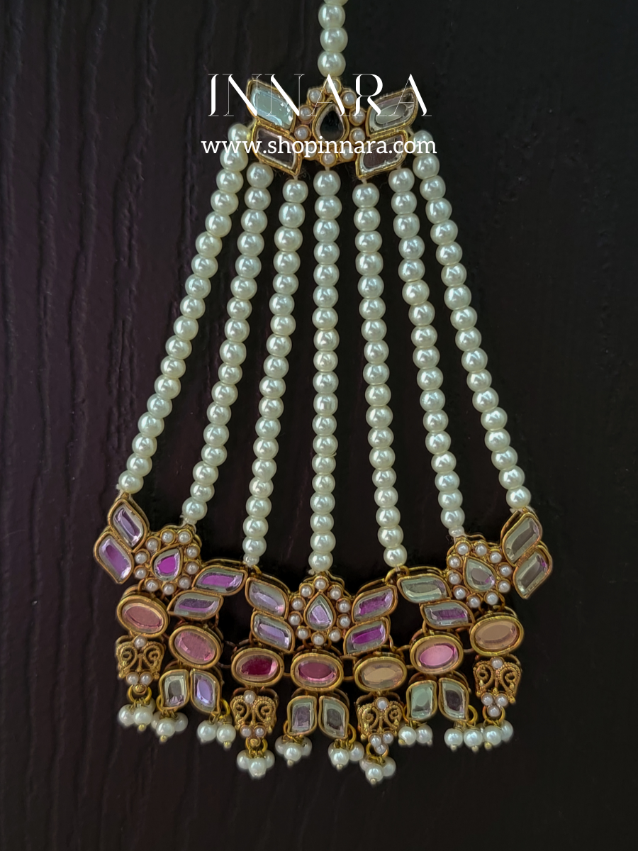 This stunning hair ornament showcases a captivating array of multi-hued stones in delightful shades of pink, purple, and clear, meticulously set to create a radiant display. Dainty pearl strands gracefully cascade, adding a touch of timeless sophistication and movement. Perfect for weddings, festive celebrations, or adding a unique, colorful statement to your traditional attire.