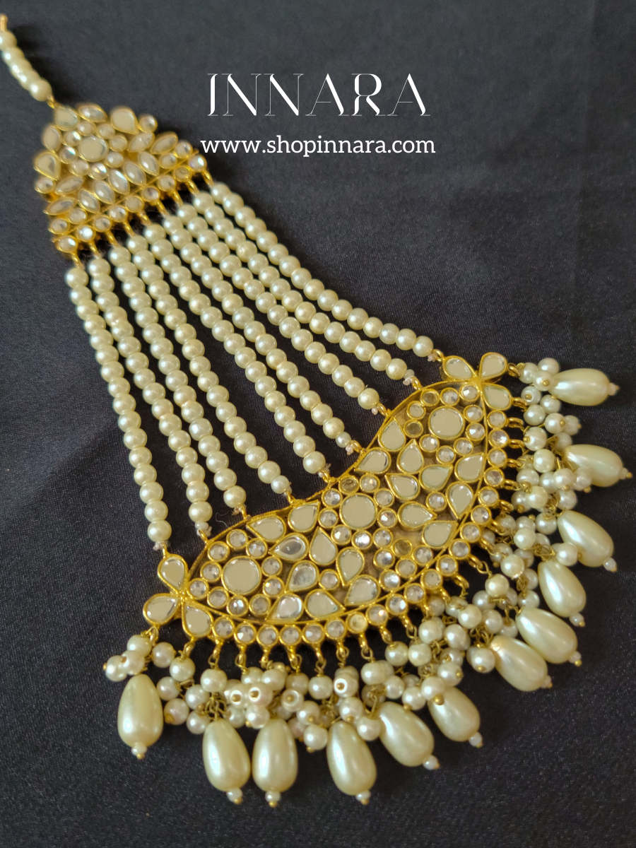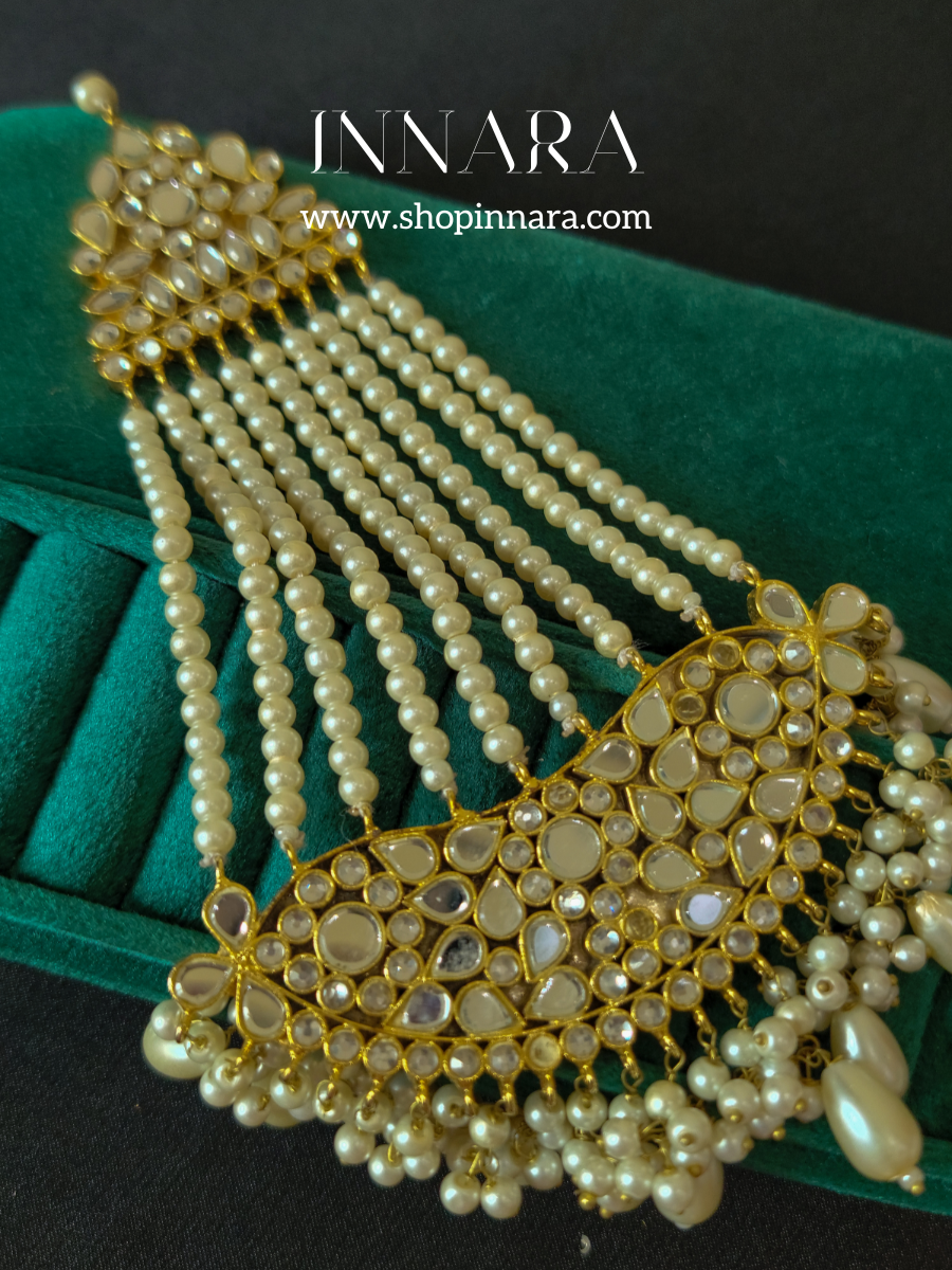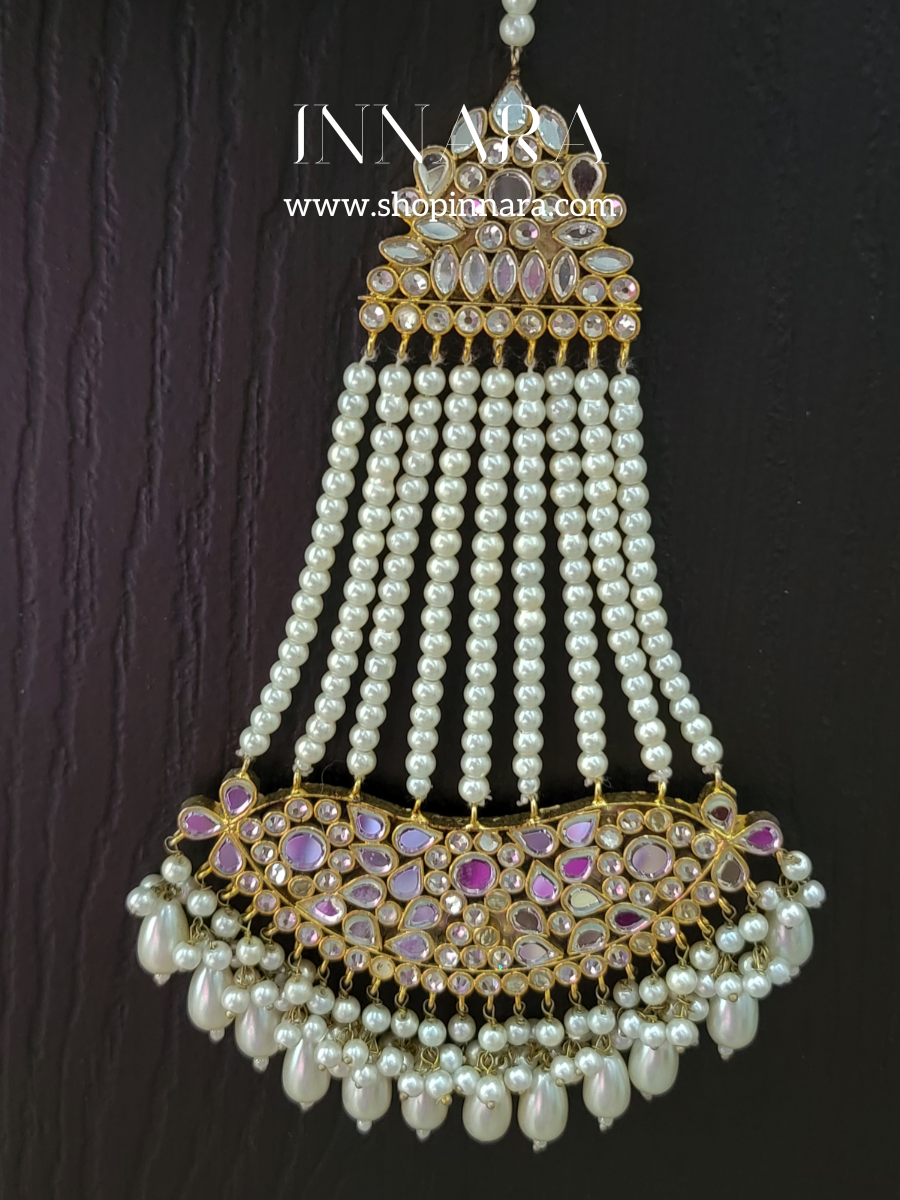 Elevate your traditional look with our exquisite Noor Jhoomar Tikka. This captivating piece features a delicate cascade of luminous pearls, beautifully complemented by intricate kundan-style stone settings. Designed to adorn your hair with regal charm, it adds a touch of timeless elegance and sparkle to any festive or bridal ensemble. A true statement of heritage beauty.