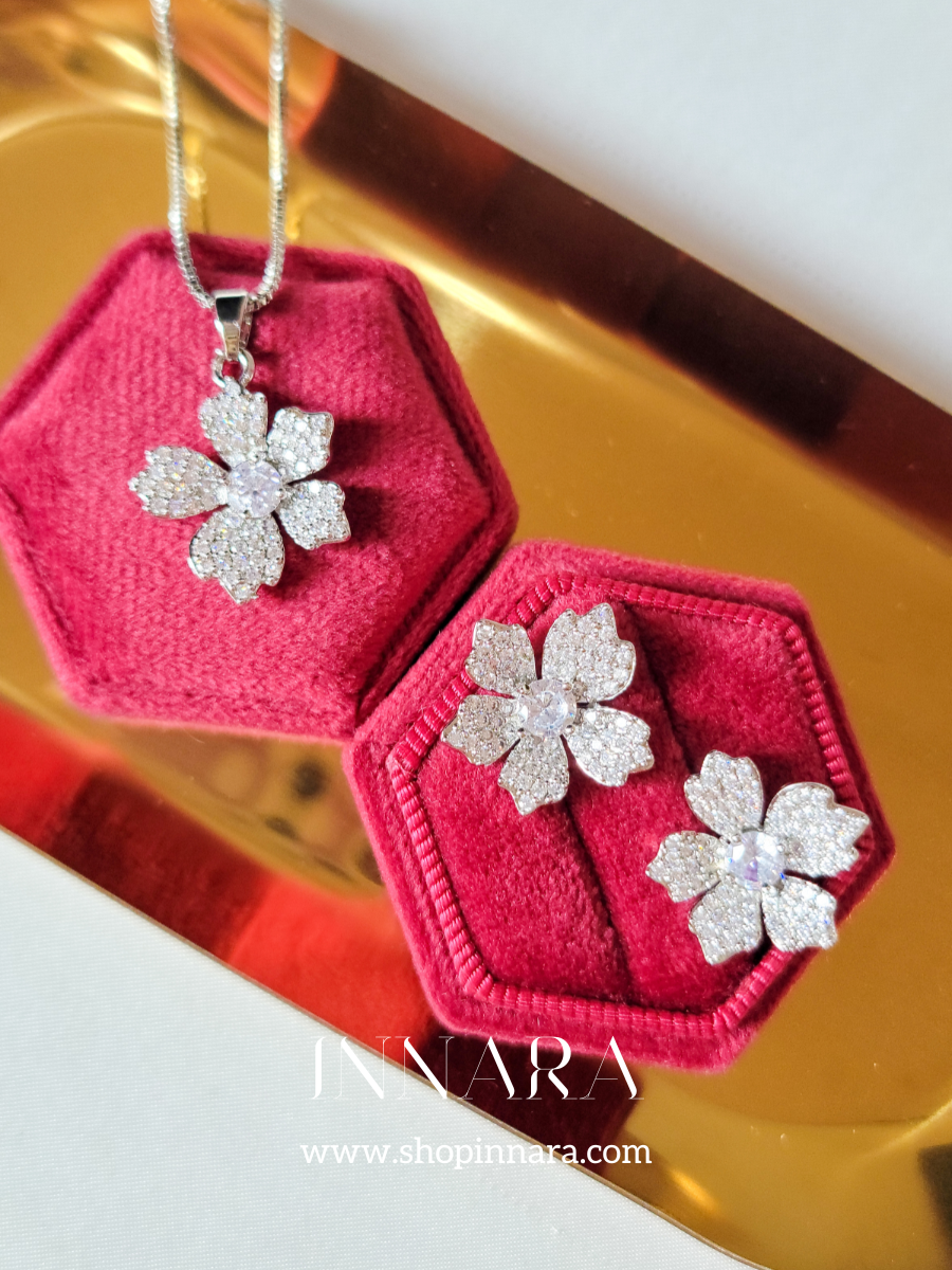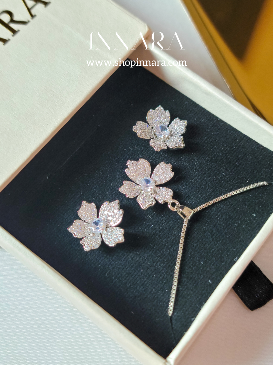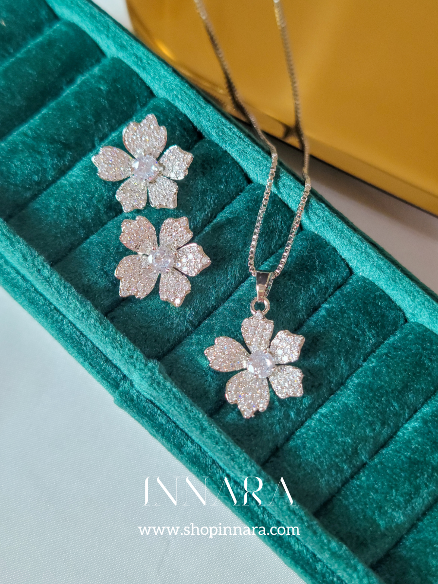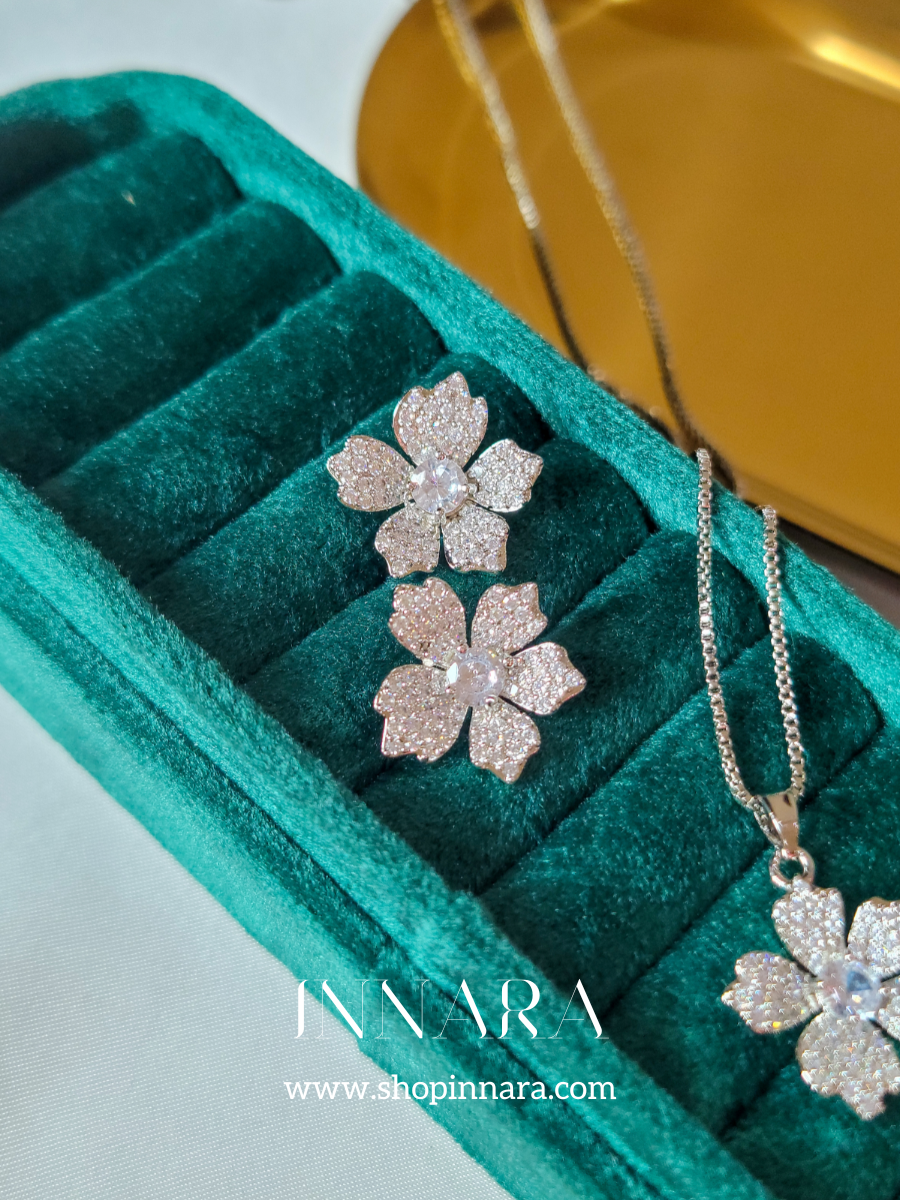 Inspired by delicate spring blossoms, this floral pendant set captures timeless elegance with its sparkling petal design and radiant center stone. Perfect for adding a soft, graceful touch to any outfit, it shines beautifully from day to night.